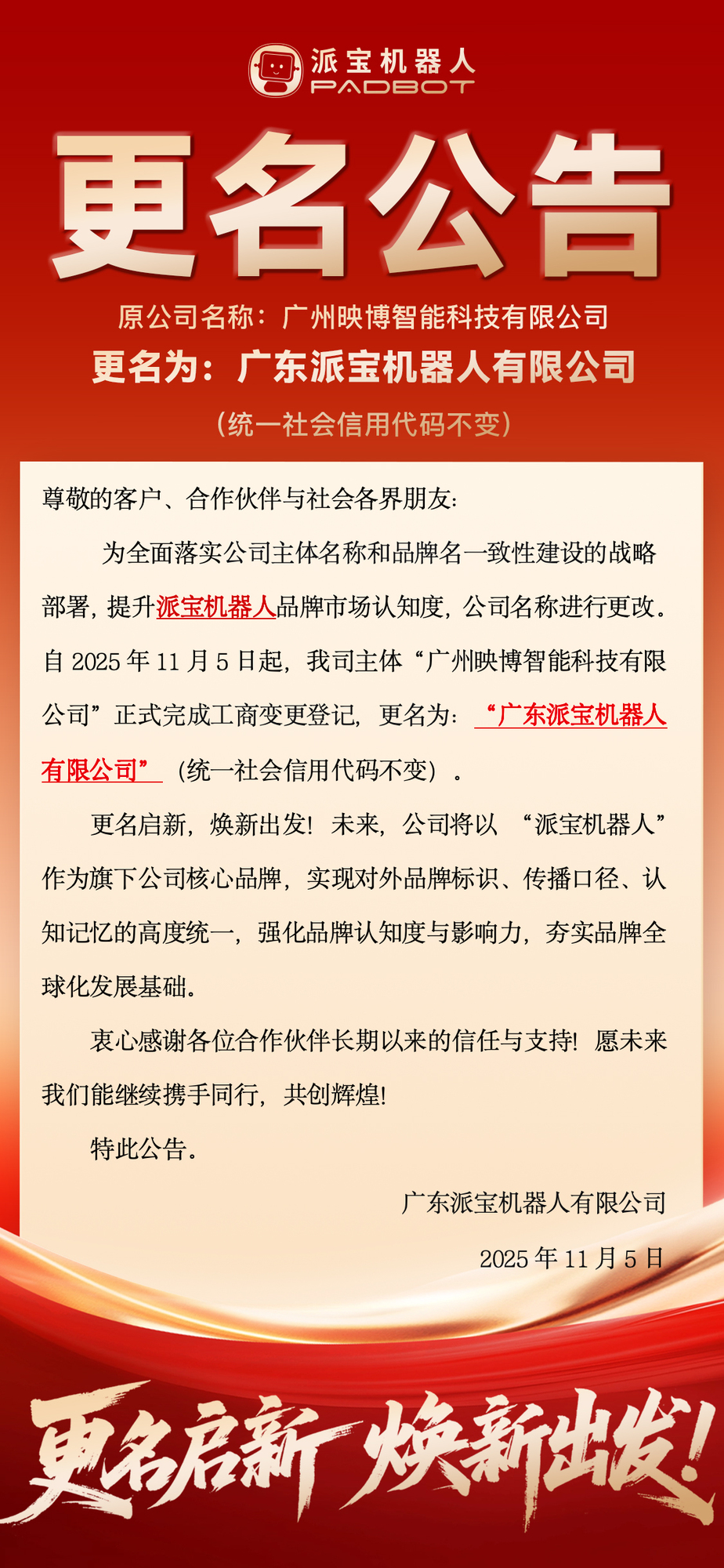 更名公告|公司主体更名为: 广东派宝机器人有限公司
